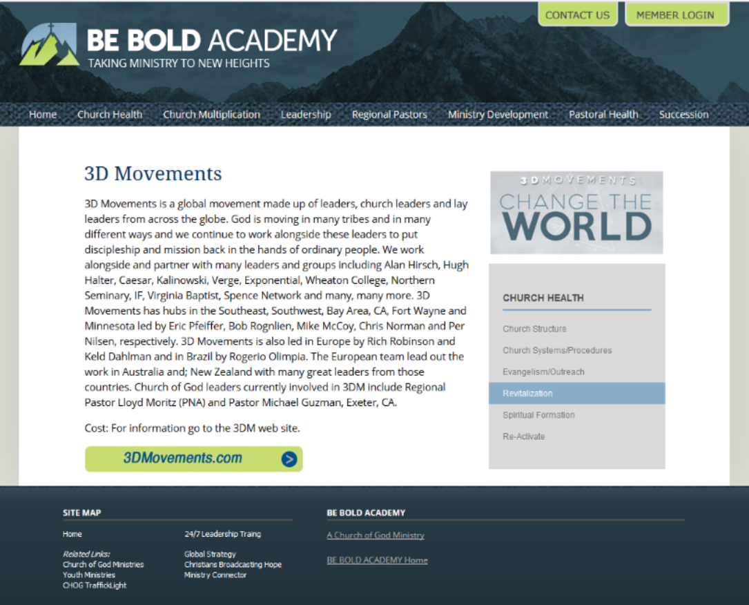 The above screen clipping is taken from the BE BOLD ACADEMY (http://www.beboldacademy.org/index.cfm/pageID/4707/index.html accessed February 15, 2016) web site ran by the Church of God Anderson Indiana. It uses language written by 3DM and used on their web site. (http://www.3dmovements.com/about/ Accessed February 15, 2016) Only the last line is added on the Church of God website, listing two Church of God ministers one of which is the district Minister for the Pacific NW Association of the Church of God (Lloyd Moritz). Right below their names is a link that takes you directly to the 3DMOVEMENTS main website. Ministers are directed under CHURCH HEALTH: Revitalization to use 3DM.